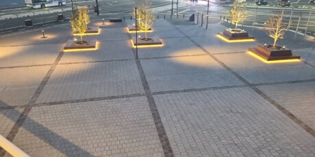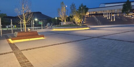 この工事の主な内容は、「外構」とある通り、文化会館の西側に位置する広場の地表部分や周辺の構造物の整備・デザインに関わるものです。
