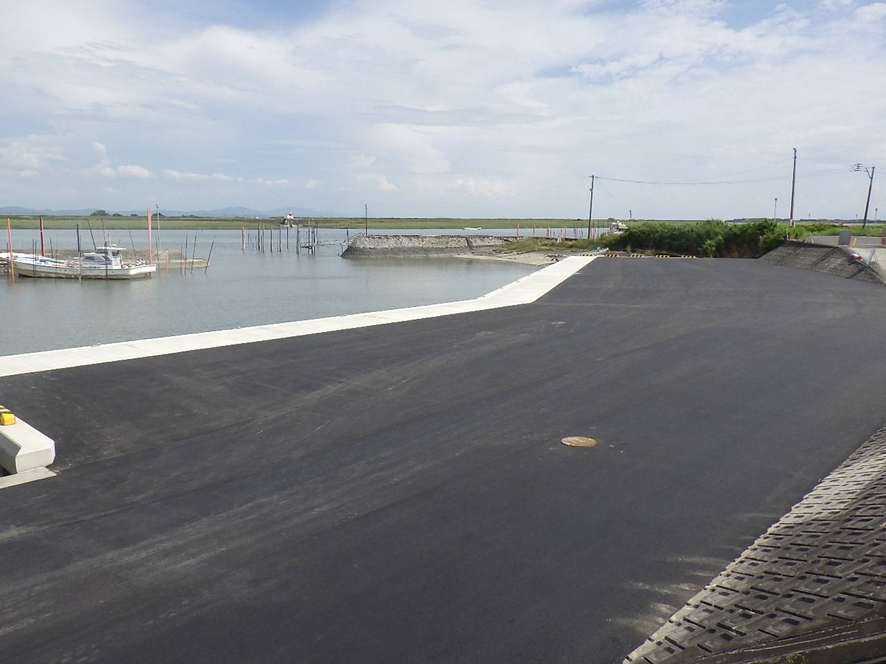 この工事は戸ヶ里避難港の敷地や舗装を高くする(かさ上げする)工事で、高潮や津波などによる浸水被害を軽減し、避難港としての機能や防災能力を向上させる目的です。