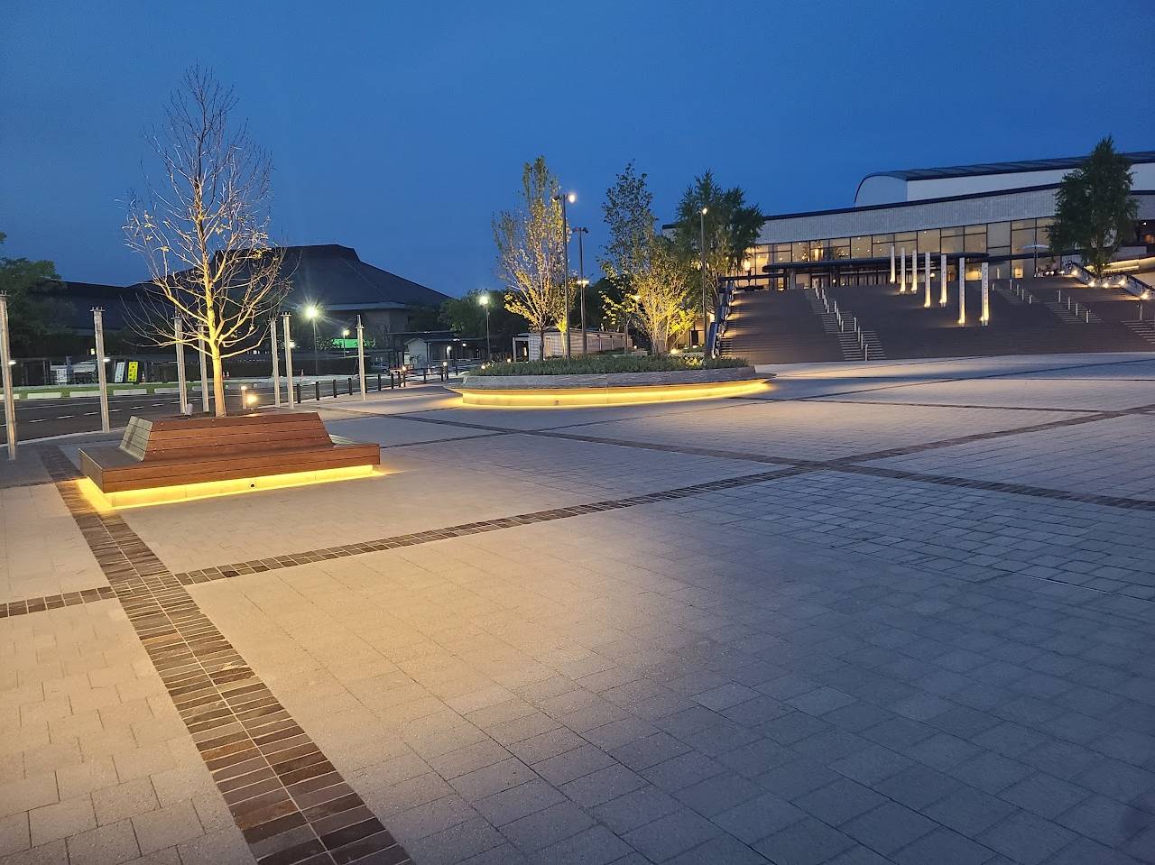 この工事の主な内容は、「外構」とある通り、文化会館の西側に位置する広場の地表部分や周辺の構造物の整備・デザインに関わるものです。